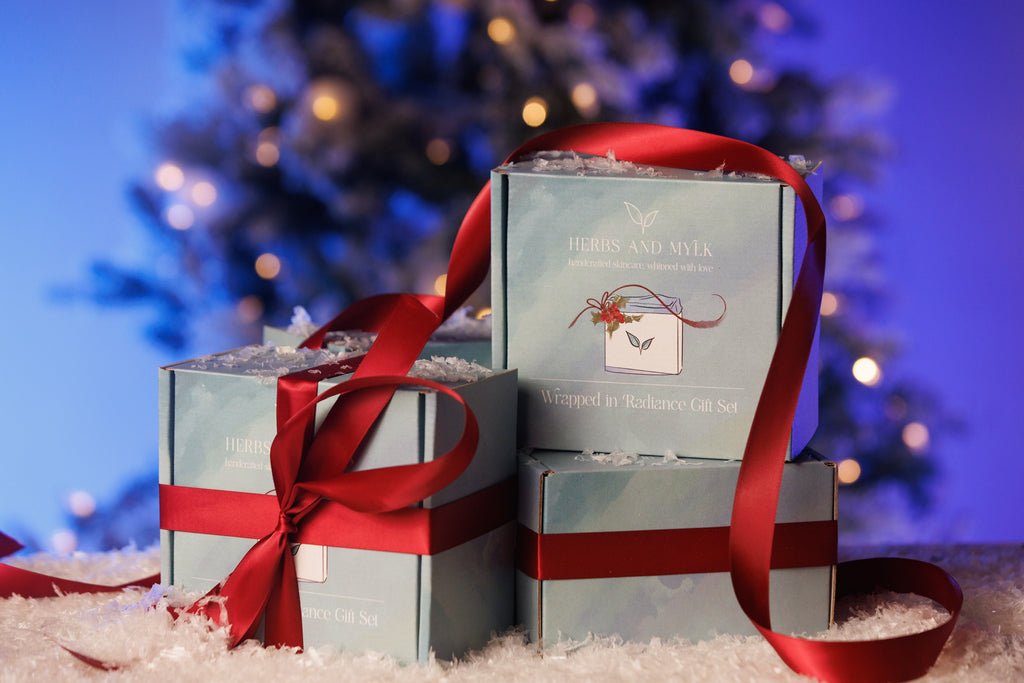 Give the gift of pure, botanical luxury with our Wrapped in Radiance Gift Box. Designed exclusively for Herbs and Mylk, this beautifully branded box features elegant, winter-inspired artwork by Fleetwood Designs and a premium satin ribbon closure. It arrives empty, ready to be filled with your favorite soaps, whipped herbal body butters, scrubs, perfumes, and more.